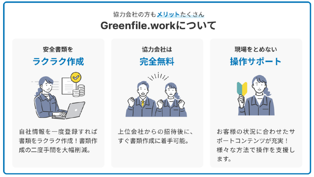 弊社では、2025年10月より、安全書類の作成・管理サービスとして『Greenfile.work』の導入を決定いたしました。協力会社は完全無料で利用ができ、安全書類の作成・提出がパソコンで手軽に行えますので、導入により貴社のご負担も減らせることかと思います。
